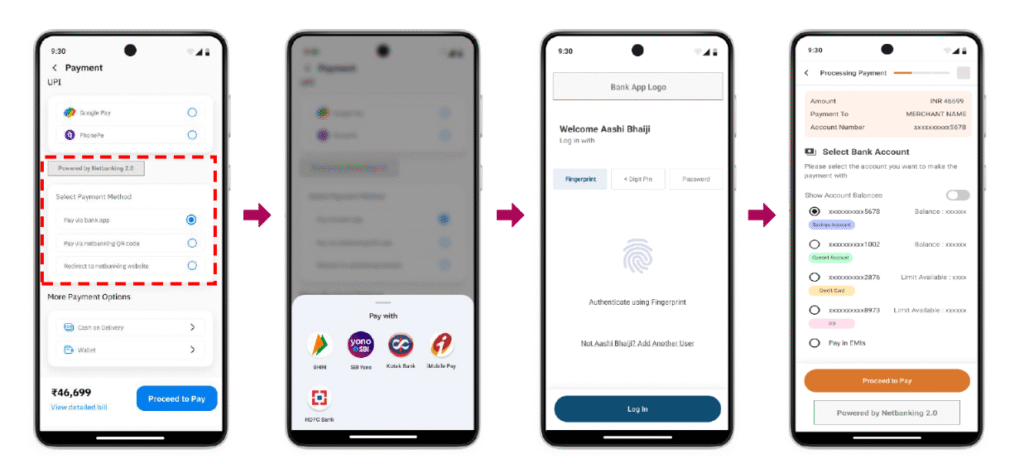 Customers complete Internet Banking payments directly through their mobile banking apps, including: App redirection, QR intent-based flows, Biometric authentication (where supported)